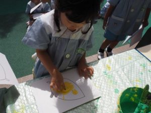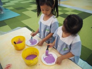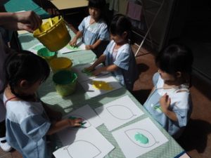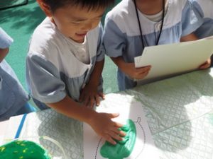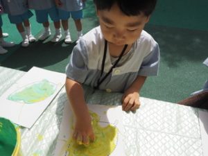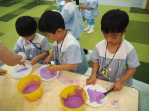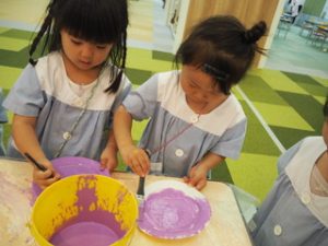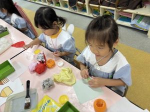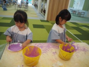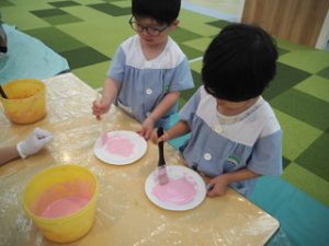 指で伸ばしたり手いっぱいに泡を付けて伸ばしたり、色が混ざったり、とっても楽しかったですね😄