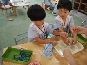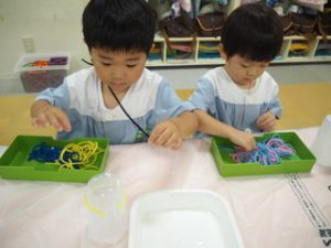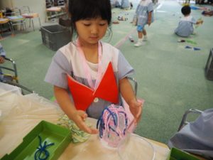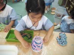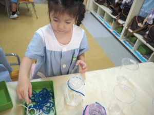 細い毛糸をコップに巻き付ける動作は指先の器用さを養います👍