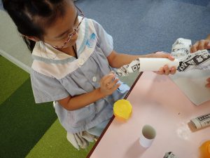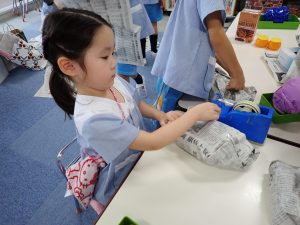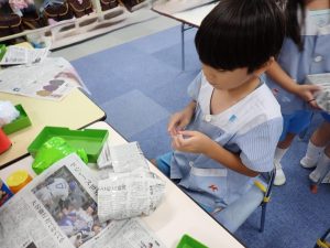体の部分は空き箱に新聞や折り紙を貼り、形を整えていきます✨