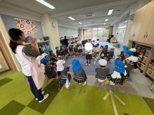 椅子が動くたびに「どこに座る?」「急いで!」と声をかけあい、中央で鬼になった時には少し照れながらも質問に答える姿がとても微笑ましく、親子で笑い合う時間が流れていました💕