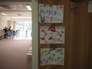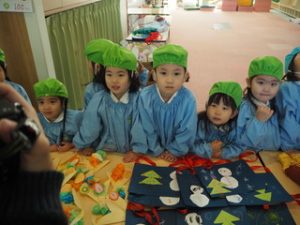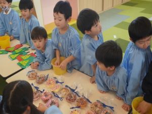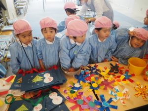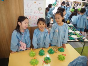 幼稚園の保育室入り口には、各クラスの品物が並びます❣️