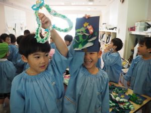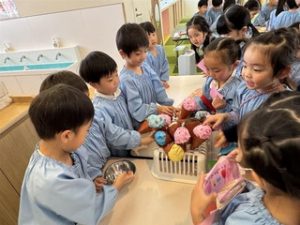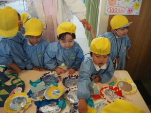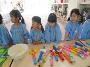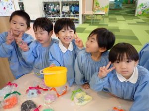 製作活動では、「どんなお店にしようかな?」「これを売ったら楽しそう!」と、子どもたち一人ひとりがイメージをふくらませながら品物づくりに取り組みました👍