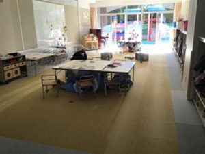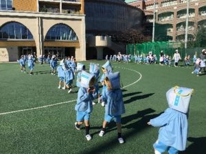 年長組は、まず中央校舎へ横に移動し、火元から距離を取り、その後グラウンドへ避難しました。状況を理解しながら行動しようとする姿に、年長児の成長を感じる場面でした。