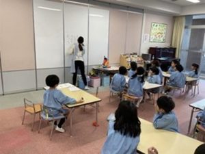 また、煙を想定した場面では、「ハンカチがなくて口を押さえられなかったとき、どうしたのか」という問いかけに対し、子どもたちから「防災頭巾で口や鼻を覆った」という声が聞かれました。子ども自身が状況を考え、身近なものを使って身を守ろうとしていたことが伝わる場面でした。