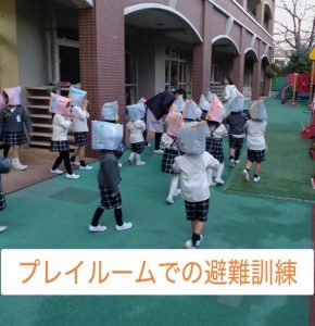 預かり保育の時間帯は、プレイルーム専任の教諭だけでなく、他の担当の先生方も避難の援助に加わり、園全体で子どもたちの安全を守ります。