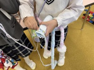 トイレットペーパーの芯に割りばしを取り付けると、あっという間に手作りの編み機が完成。子どもたちは夢中になって毛糸を編み進めています❣️