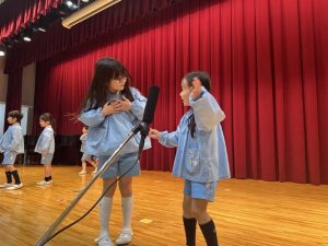 先生たちのお楽しみの後は、年長組で初めてマイクを使ってセリフの練習をしてみました❗❗